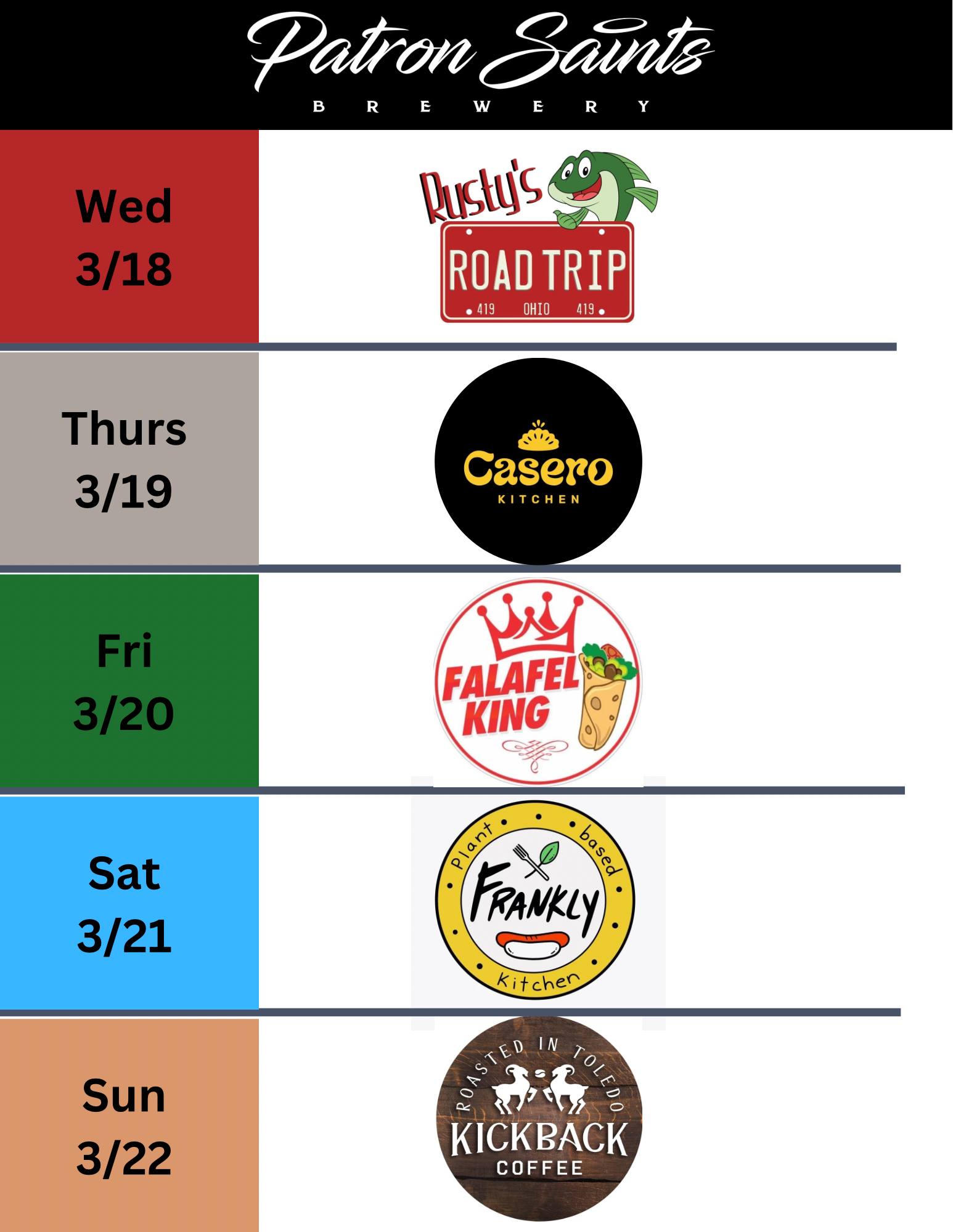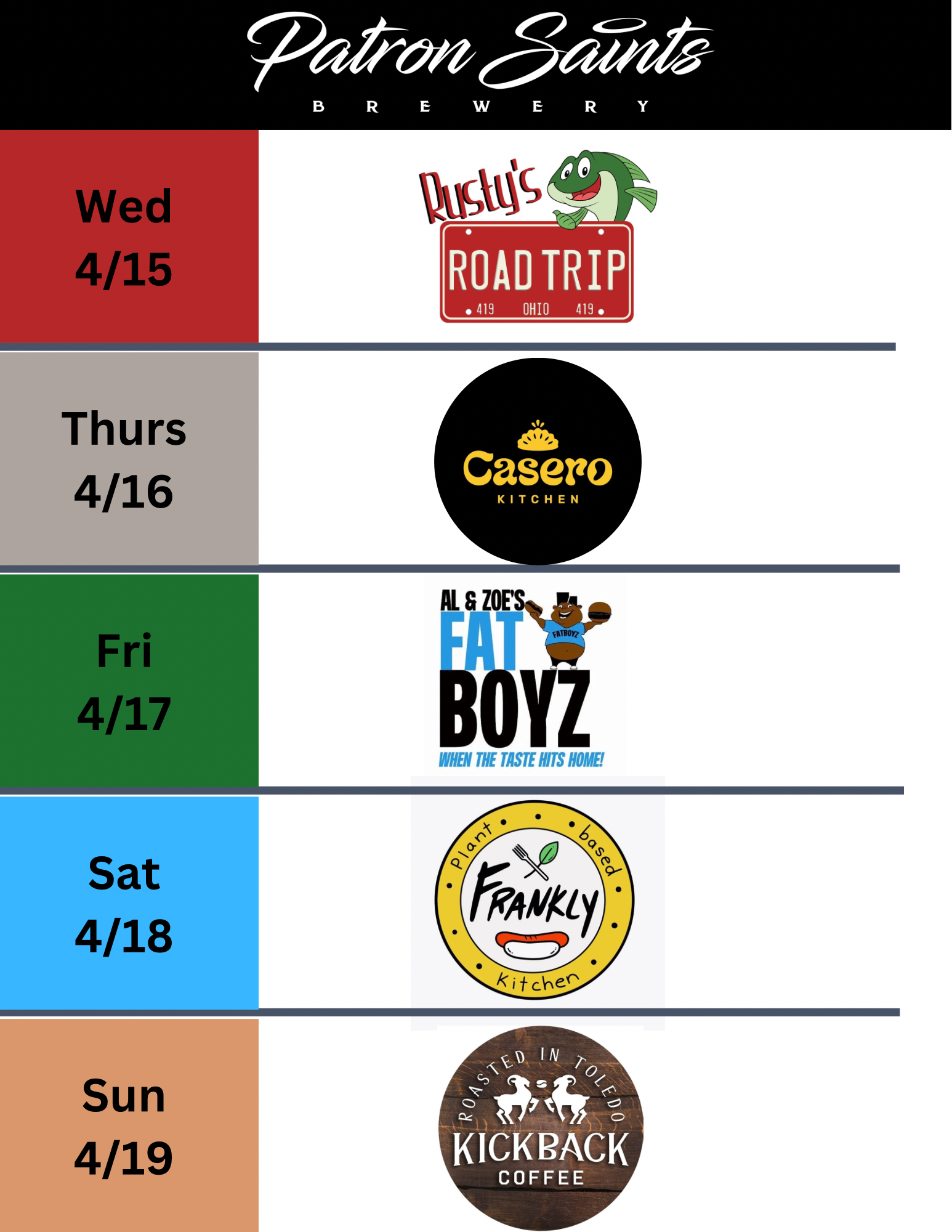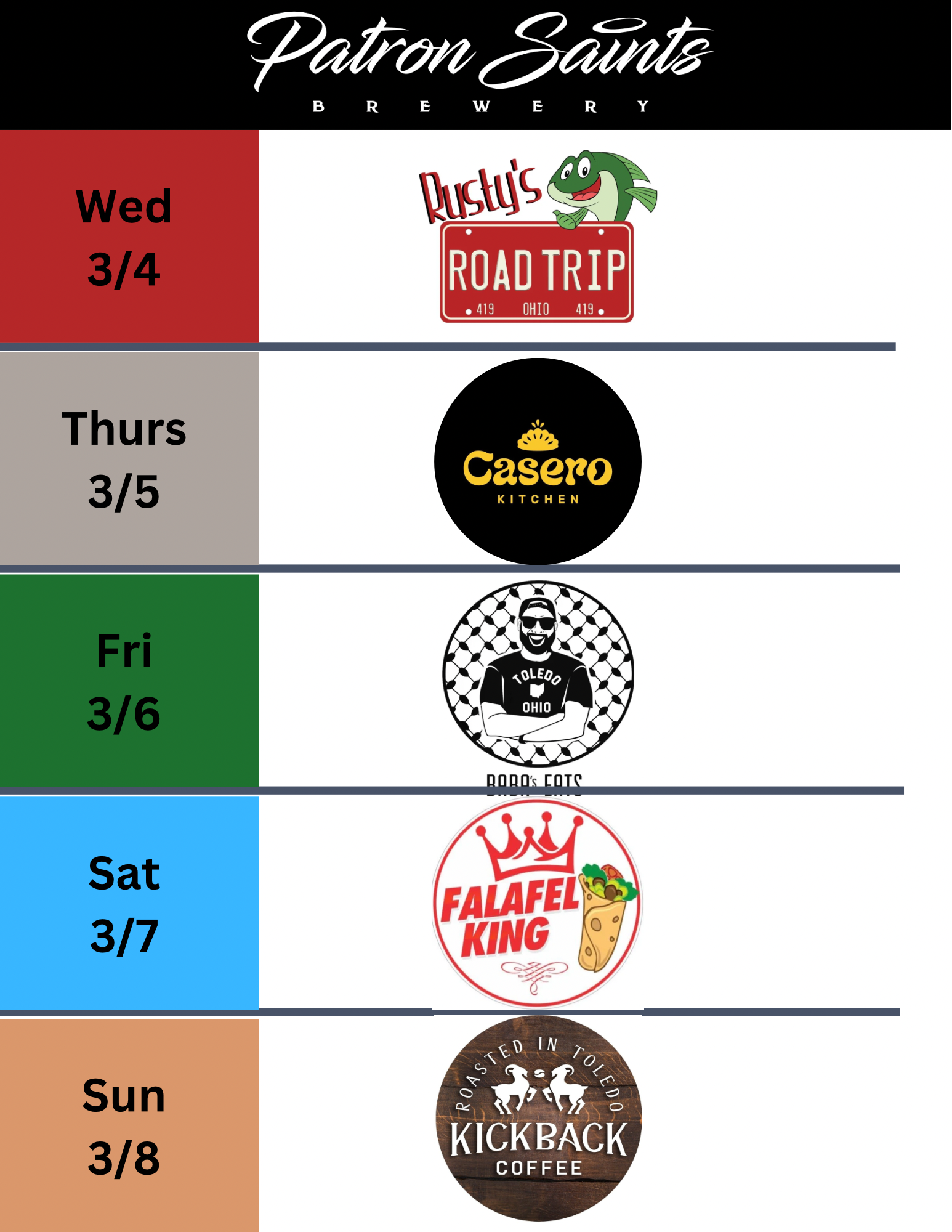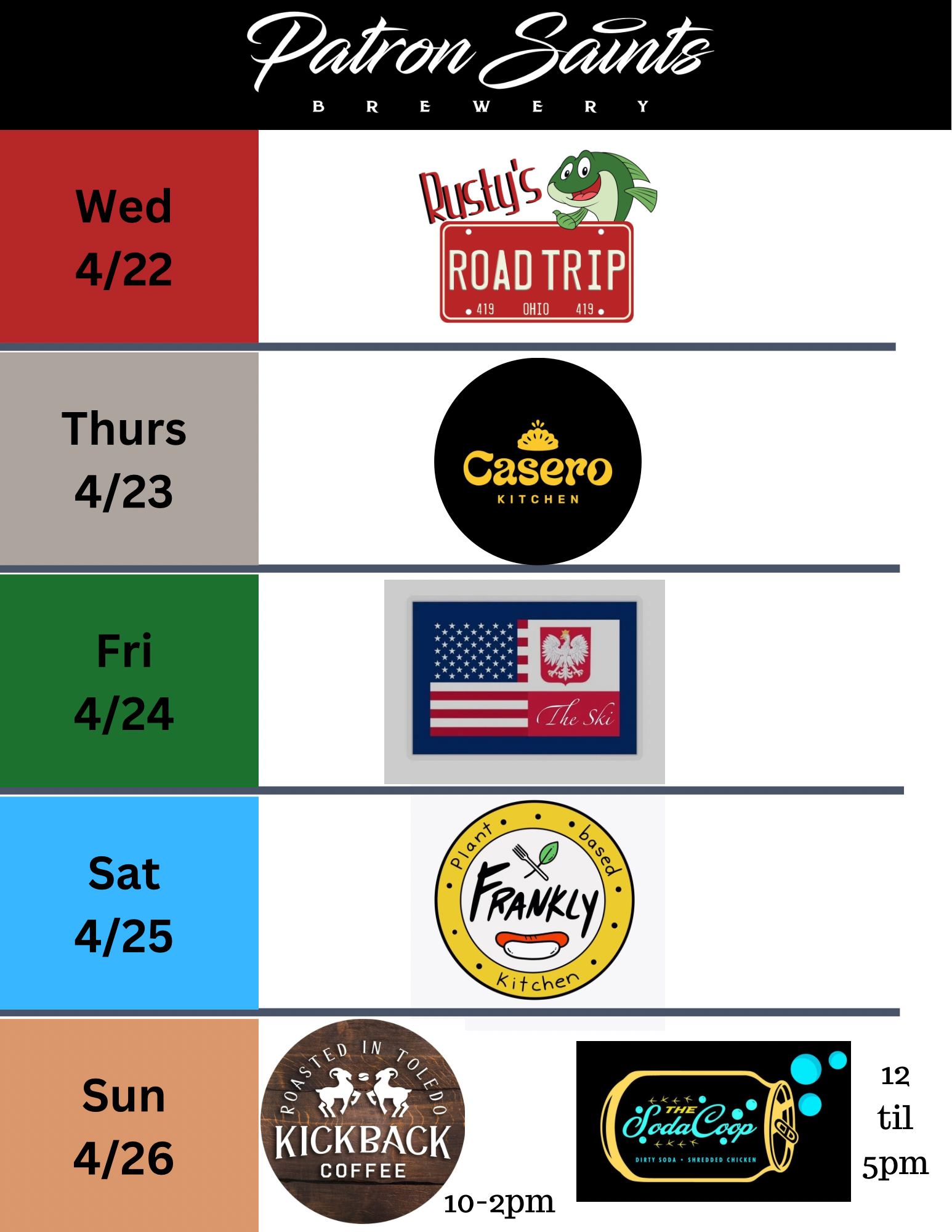 Patron Saints Brewery is a West Toledo nano brewery crafting a variety of Saintly beers, seltzers and root beer. Come enjoy pints and tasters in our Heavenly taproom which is "1/2 pint" and "little growler" friendly (aka kids & dogs). We fill growlers and 16oz cans to go. PSB does not serve food but hosts a variety of food trucks (see below) and allows patrons to bring their own food or snacks into our taproom.