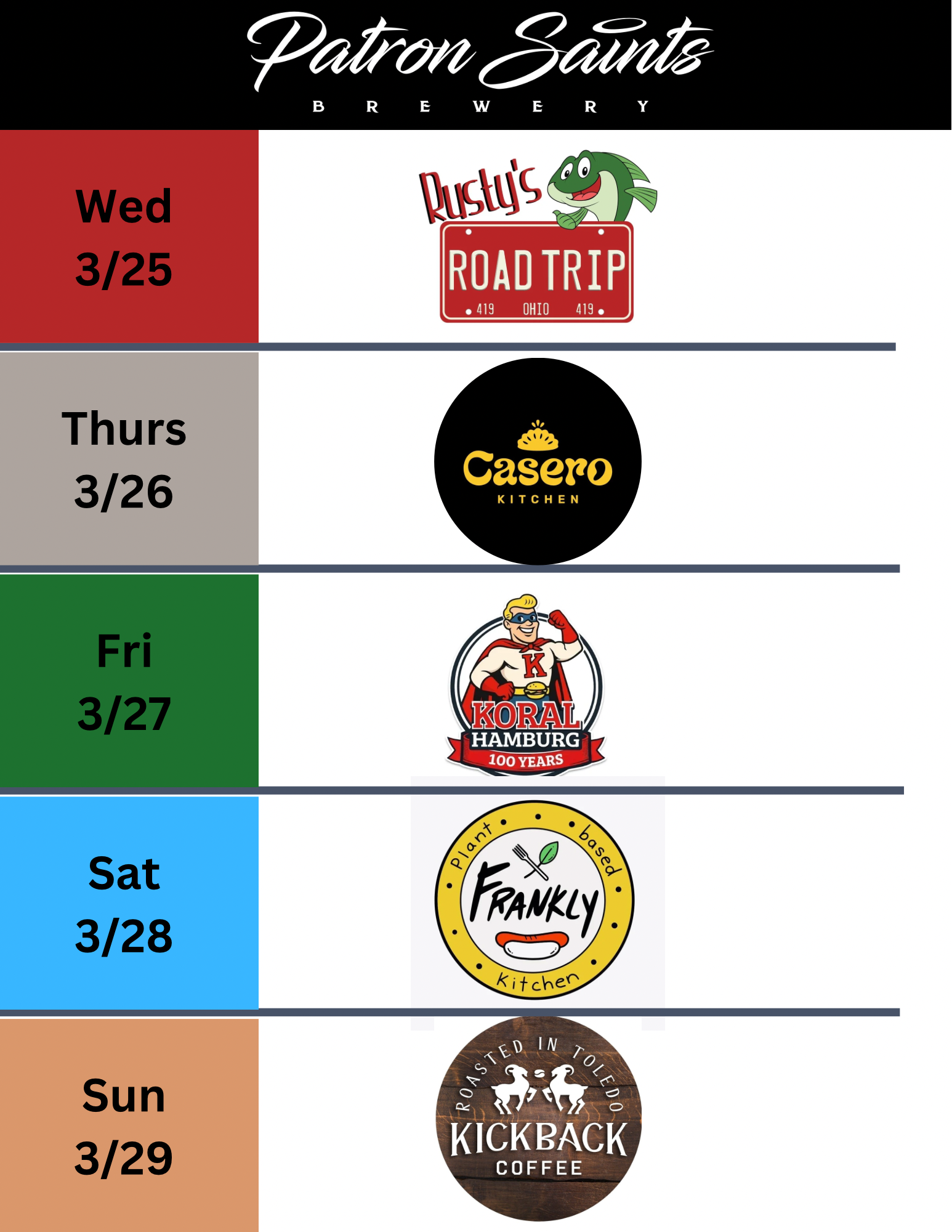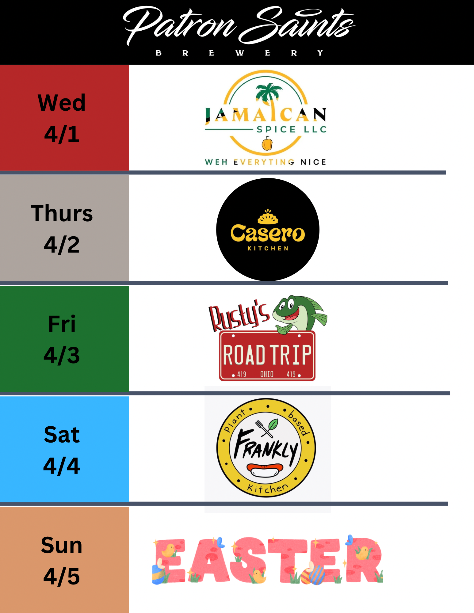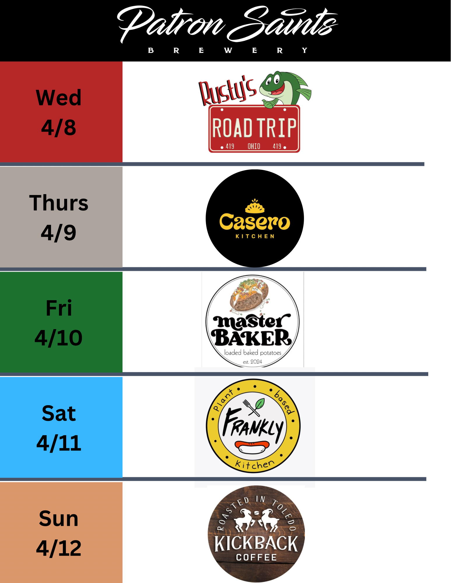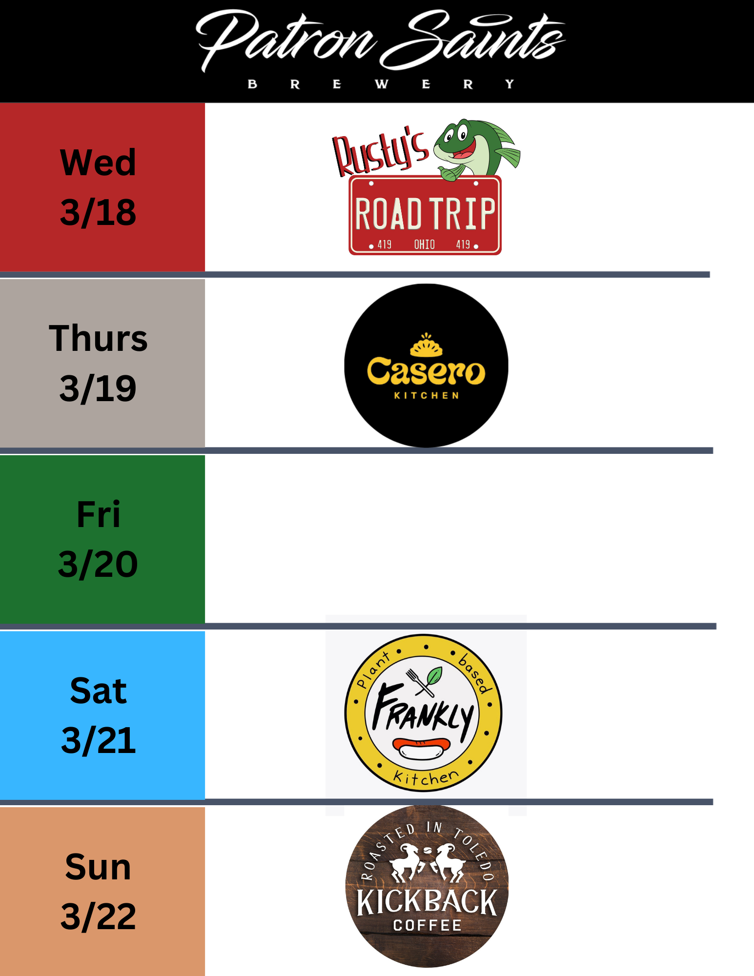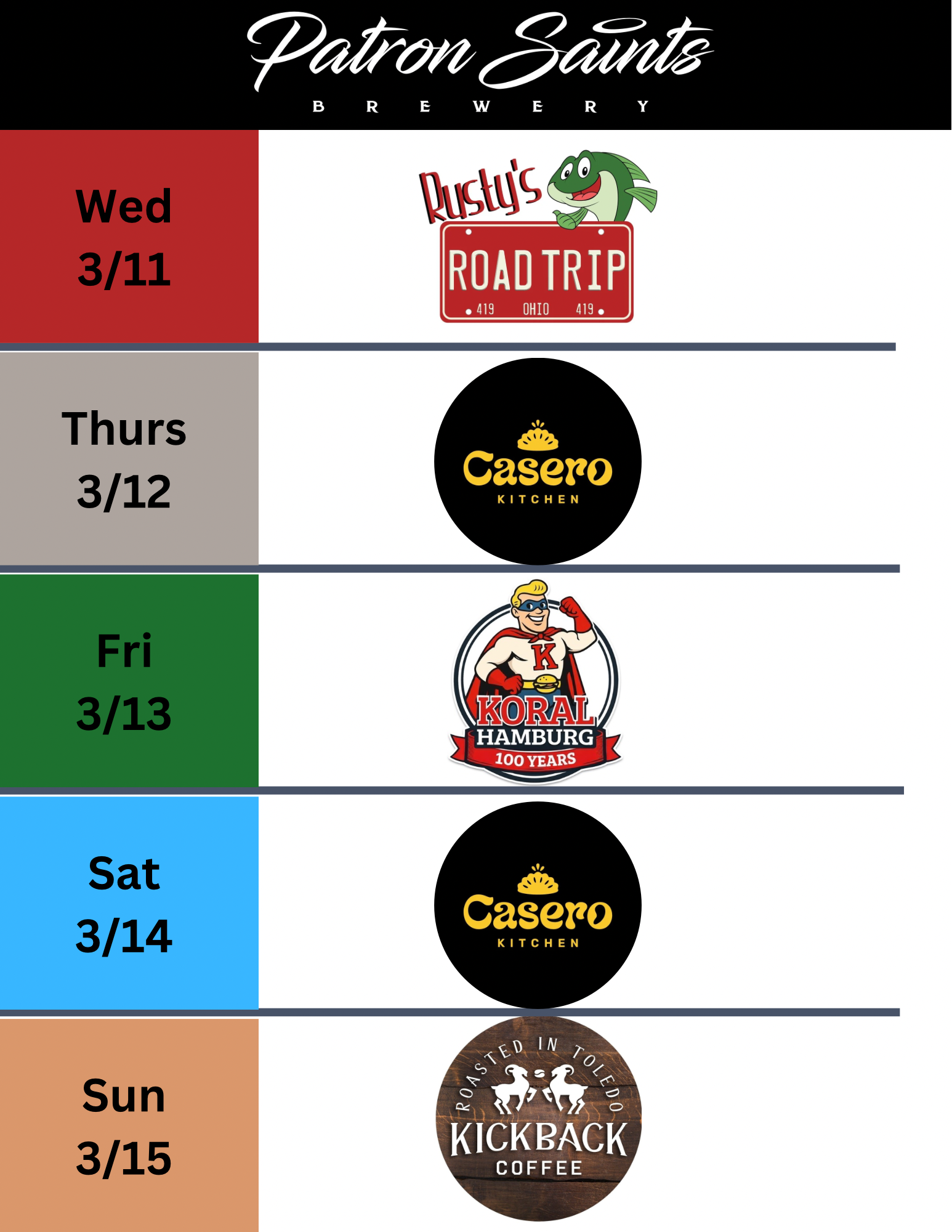 Patron Saints Brewery is a West Toledo nano brewery crafting a variety of Saintly beers, seltzers and root beer. Come enjoy pints and tasters in our Heavenly taproom which is "1/2 pint" and "little growler" friendly (aka kids & dogs). We fill growlers and 16oz cans to go. PSB does not serve food but hosts a variety of food trucks (see below) and allows patrons to bring their own food or snacks into our taproom.